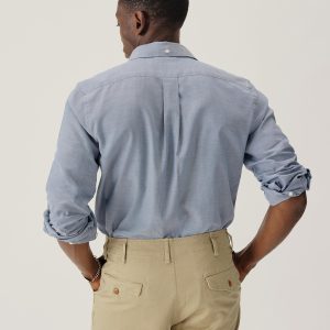 Classic fit button down collar shirt cut from a proprietary 3 oz blend of cotton and tencel. Details include mother of pearl buttons, a single scallop pocket, and a box pleat at the back. Constructed with clean finished seams. Garment washed for a lived-in look and feel.