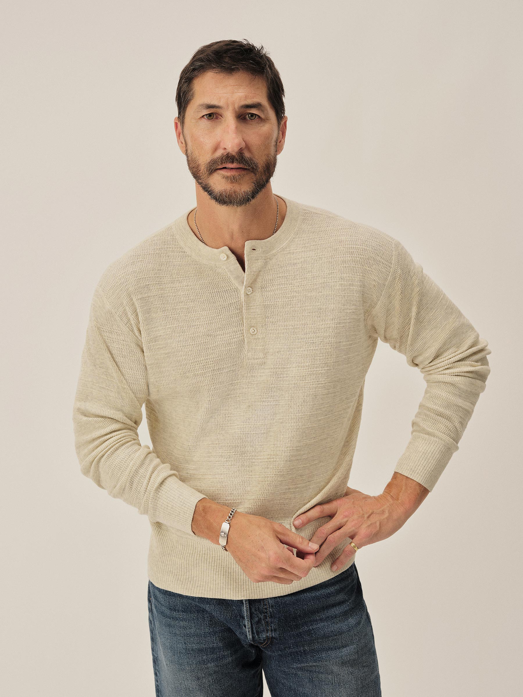 A standard fit, vintage-inspired thermal stitch henley crafted from slubby, yarn-dyed cotton. Featuring variegated rib finishes at the cuffs and bottom hem, and coverstitching along the seams. Finished with a three button shell closure.