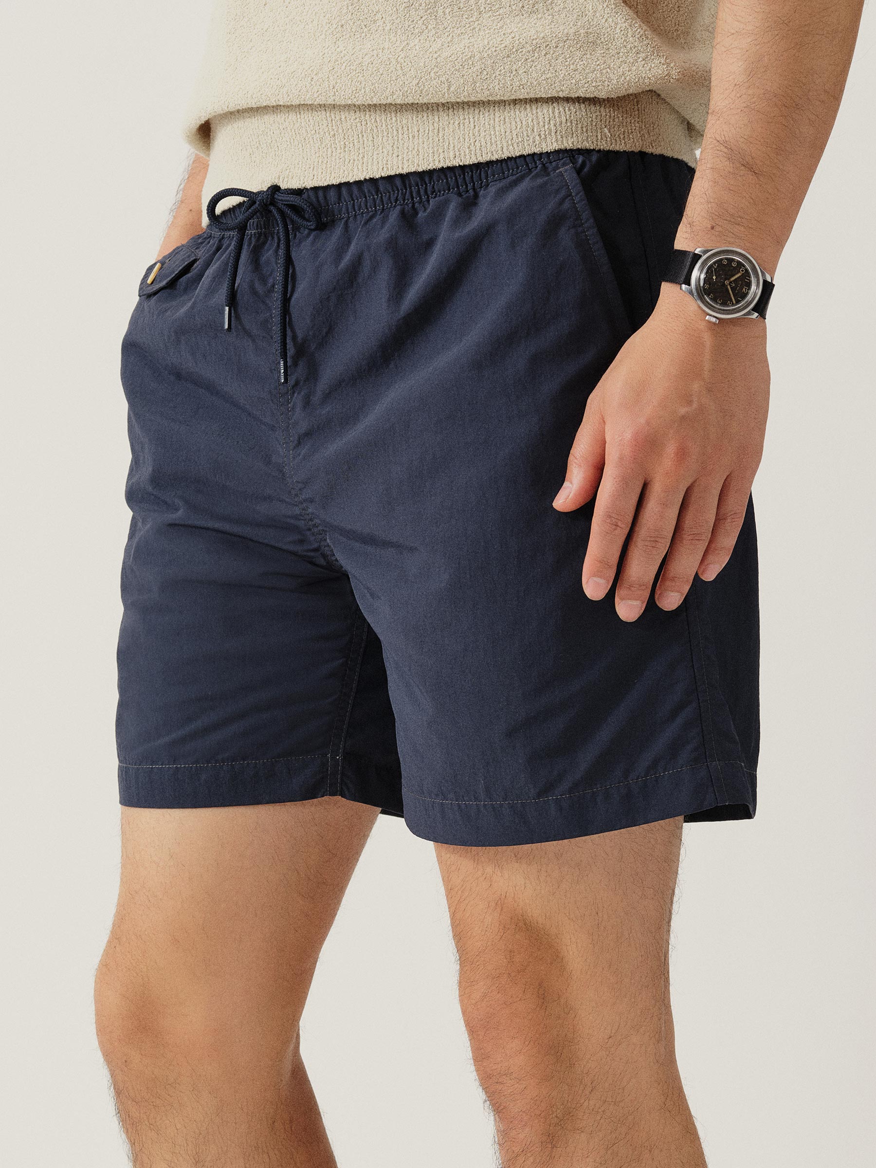 Classic swim shorts are made from lightweight woven nylon using recycled plastic waste found in the ocean. They feature an elastic waistband with an added drawstring for the perfect fit. A small front buttoned pocket and button flapped back pocket help you stow your necessaries in addition to two front slash pockets. 5.5-inch inseam.