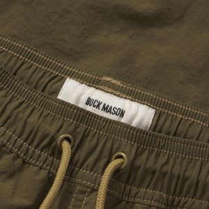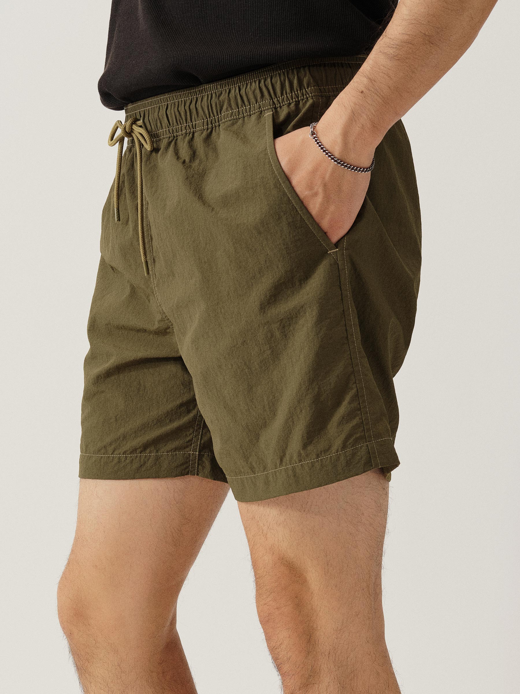 Classic swim shorts are made from lightweight woven nylon using recycled plastic waste found in the ocean. They feature an elastic waistband with an added drawstring for the perfect fit. A small front buttoned pocket and button flapped back pocket help you stow your necessaries in addition to two front slash pockets. 5.5-inch inseam.