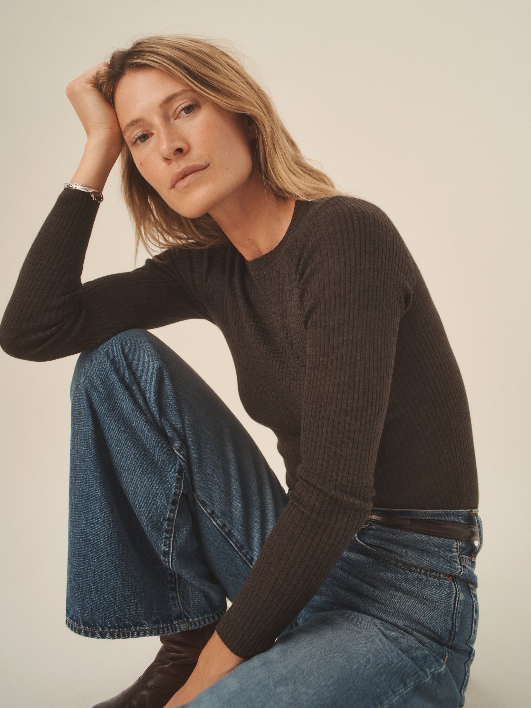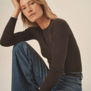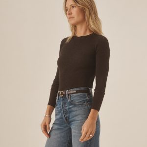 Slim fit crewneck sweater in a 24″” length, elevated in a 14 gauge variegated rib knit from a blend of merino wool, silk, and cashmere. Luxe, easy, and ideal for layering. Constructed with self-starting hem and sleeve trim and fashioning at the neckline and back shoulder for durability.
