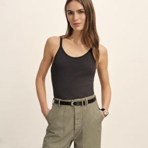 Slim-fit, vintage-inspired scoop tank made from a blend of 60% recycled cotton and 40% cotton. Featuring a combo of jersey fabric and scallop stitch details at the armholes and neckline, it also includes baby snaps for the bra holder.