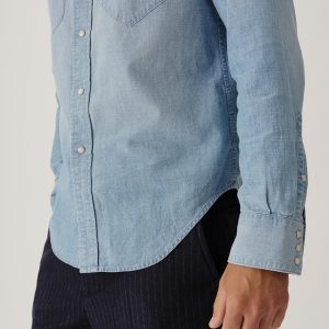 A classic western-style workshirt in a washed cotton chambray. The shirt has all cowboy details like pearl snap closures, curved western yoke, scalloped flap pockets, and three snaps along the cuffs. The blue chambray cotton has been washed for a lived-in feel.