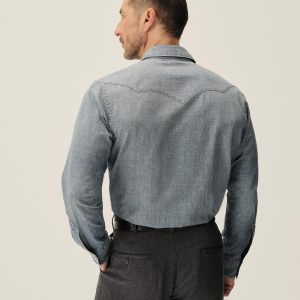 A classic western-style workshirt in a washed cotton chambray. The shirt has all cowboy details like pearl snap closures, curved western yoke, scalloped flap pockets, and three snaps along the cuffs. The blue chambray cotton has been washed for a lived-in feel.