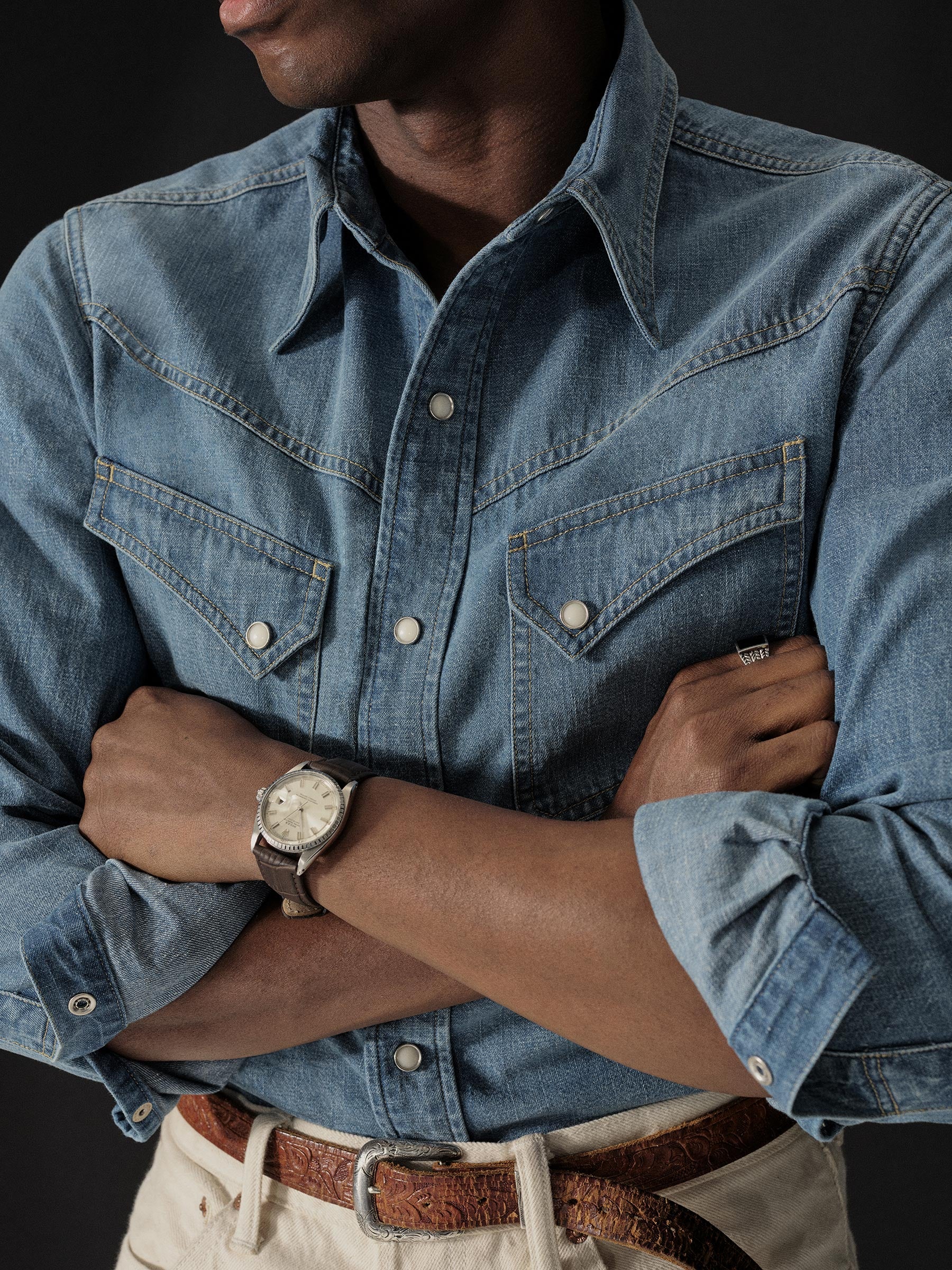 A slim fitting, tailored take on western shirts from the early 1950s. The angled front yoke, extending all the way to the center front placket reinforces the top half, just as it did for ranchers and cowboys. Constructed with felled seams and chain stitching to enhance strength and durability. Finished with pearl snaps and a wash that carefully details the character and texture of a decades old classic.