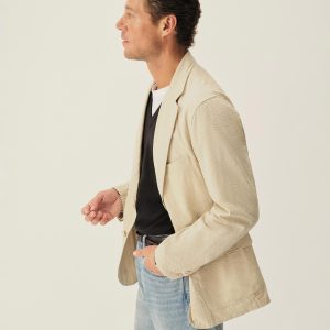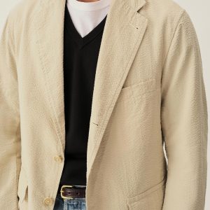 Tailored 3-roll-2 button blazer inspired by timeless vintage suiting. This 5 oz cotton seersucker has a rippled texture that wicks moisture and maintains airflow making it ideal for warmer climates. Details include two patch pockets, two internal welt pockets, and a notched lapel. We left it unlined and omitted the back vent and cuff buttons for a casual, streamlined look. Constructed with hand-linked seams and garment washed with enzymes and softener for a lived-in feel.