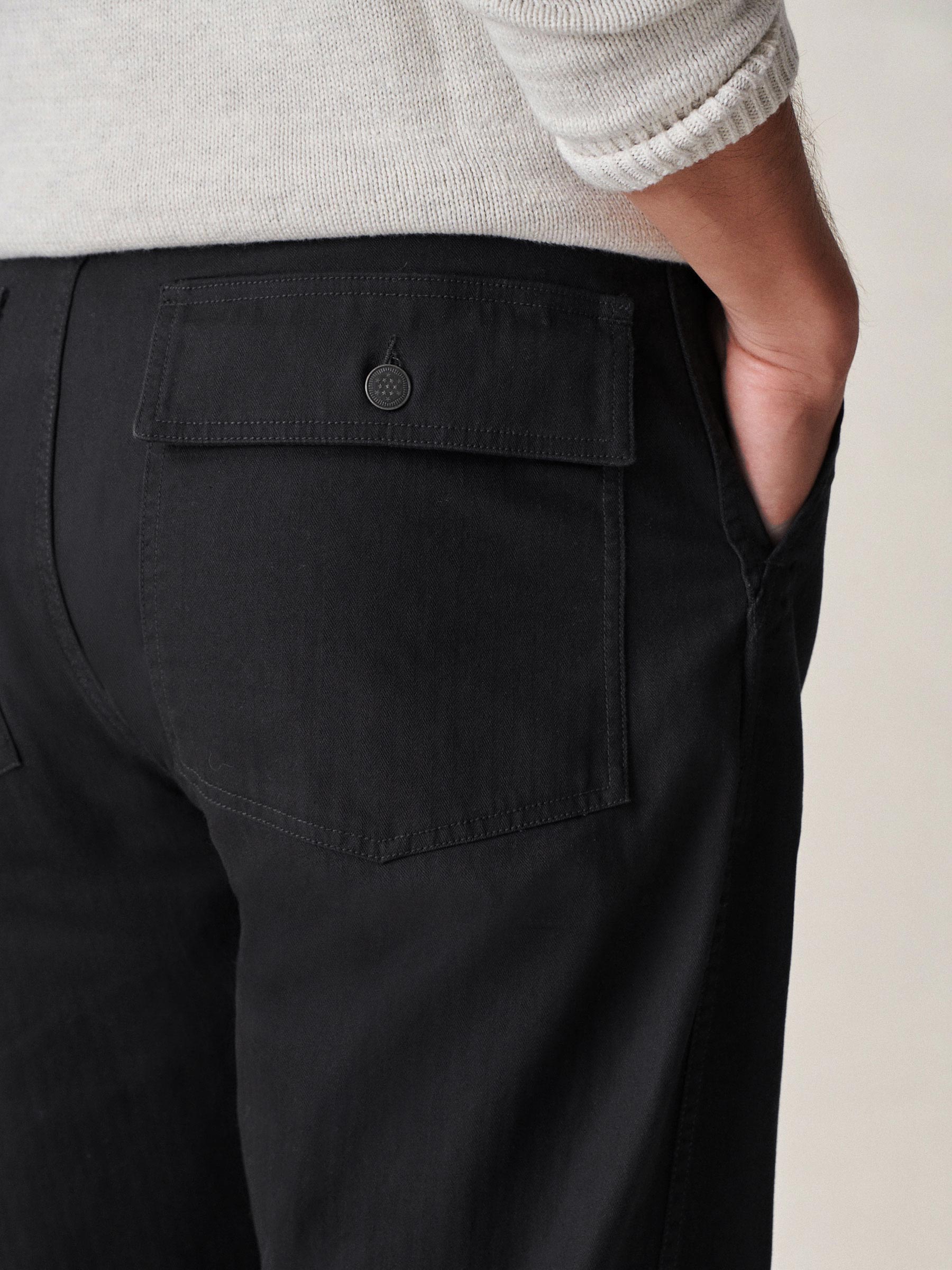 Our homage to WW2-era military style fatigues, cut in a true-to-original relaxed fit with a slightly higher rise and straight leg. This lightly structured 9.4 oz.cotton twill has a herringbone weave and has been garment washed for a lived-in feel. Features a Hollywood waistband, felled seams, patch and flap back pockets, and 13-star tack buttons — all true to the original WW2 model.