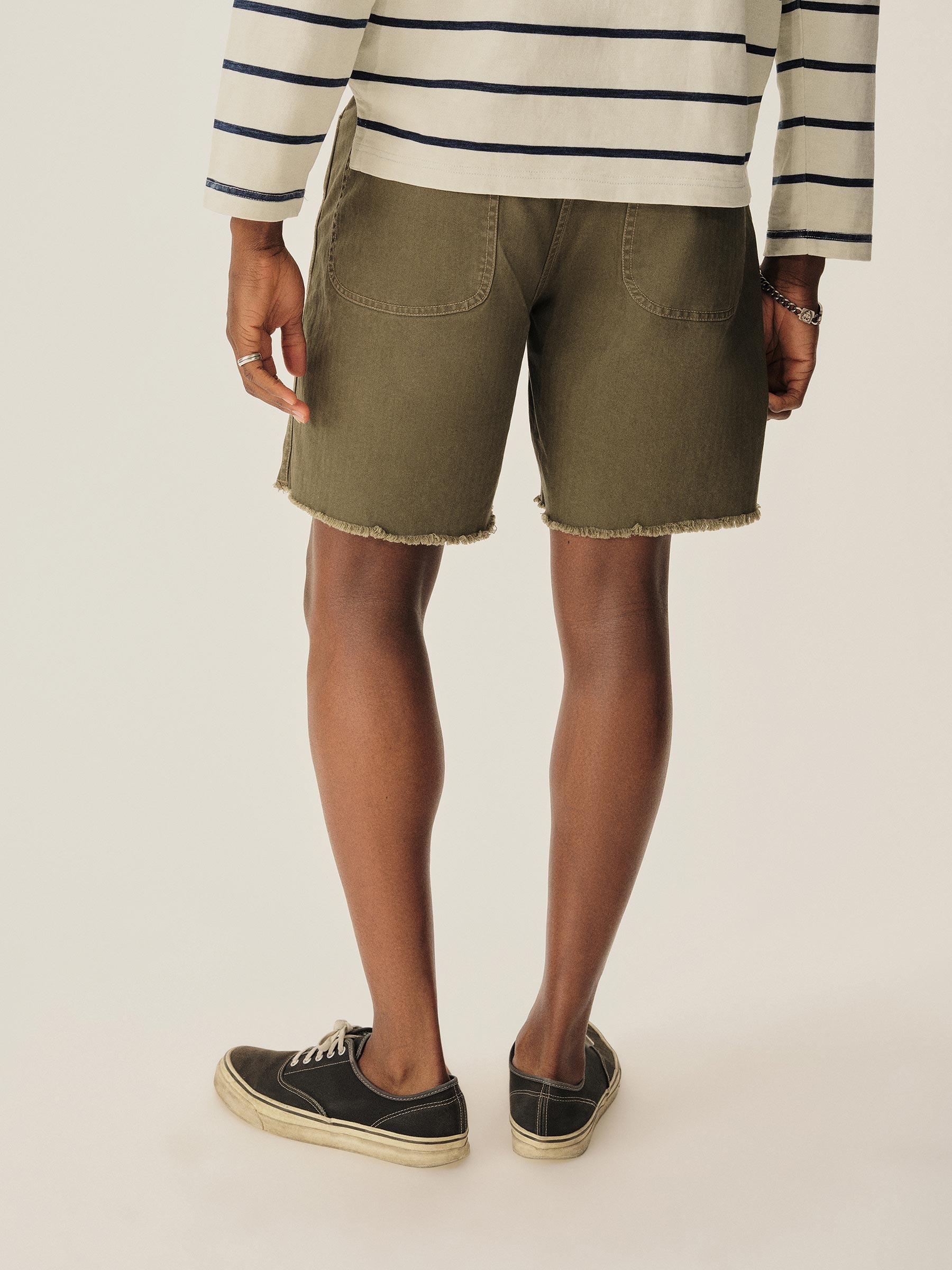 Our homage to WWII-era military-style fatigue cut-offs. Cut in a true-to-original relaxed fit with a slightly higher rise and roomy thigh, in a lightly structured 9.4 oz. herringbone twill. Constructed with felled seams, patch-and-flap back pockets, and 13-star tack buttons — all authentic to the original WWII model. Garment-washed for a lived-in feel.