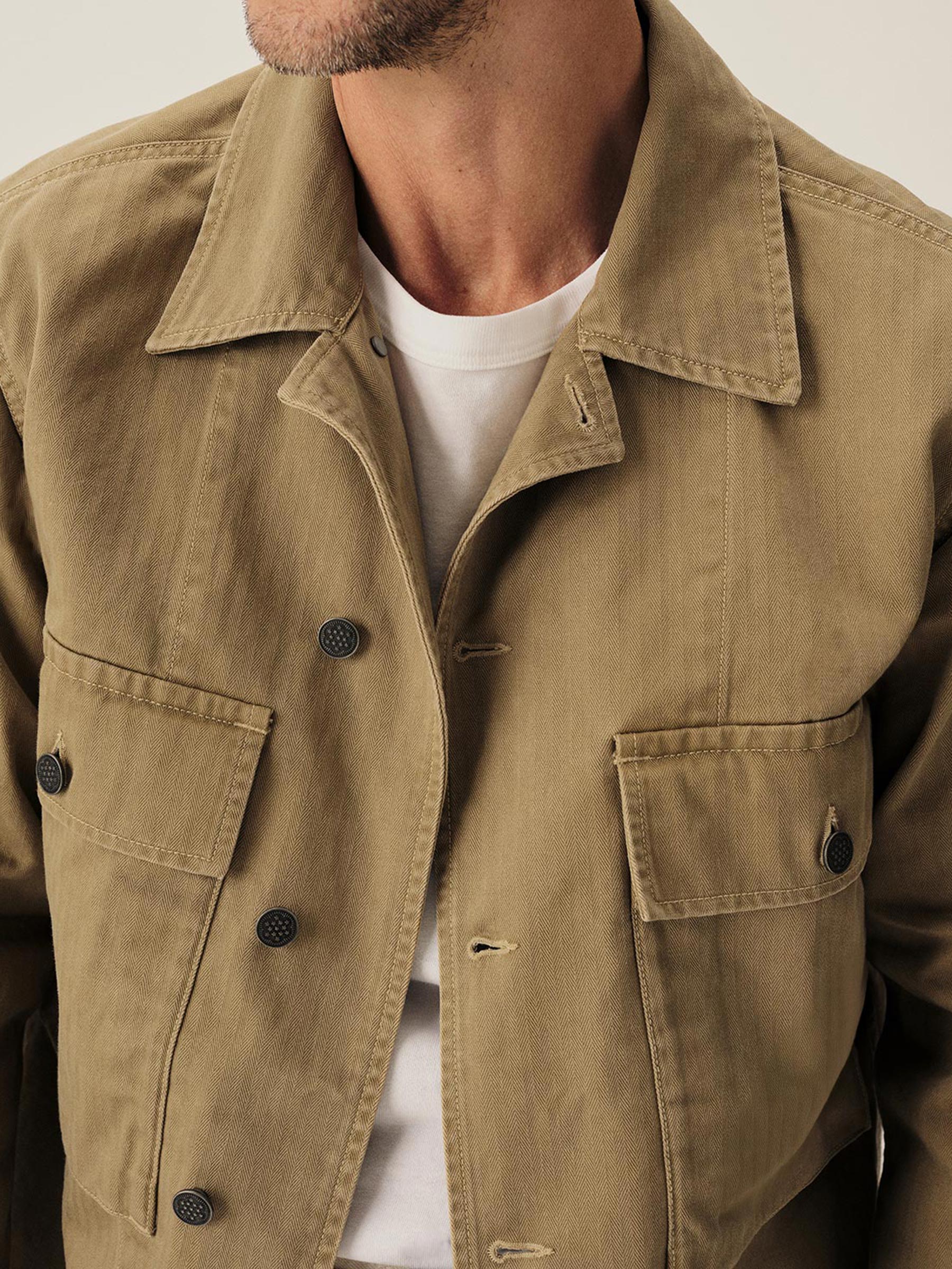 Our homage to WW2-era military style fatigues, cut in a true-to-original relaxed fit designed for range of motion with room to layer underneath. This lightly structured 9.4 oz.cotton twill has a herringbone weave and has been garment washed for a lived-in feel. Features two large bellows front pockets, a back yoke panel for mobility, felled seams, button-front closure, single-button cuffs, and 13-star tack buttons — all inspired by the original WW2 model.