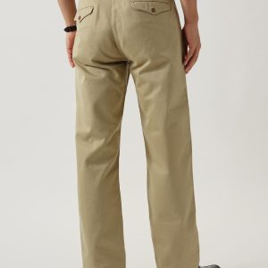 The classic officer’s pant in our Full Saddle fit: high-rise, straight through the thighs and leg. Cut from 9.5 oz cotton twill that has been washed to achieve the same look and feel of vintage service uniforms. Features a “Hollywood” one-piece waistband construction, slash front pockets, buttoned flap back pockets, and a welted coin pocket, natural canvas interior detailing, and real corozo buttons. Garment washed with enzymes for a lived-in feel. Button fly.