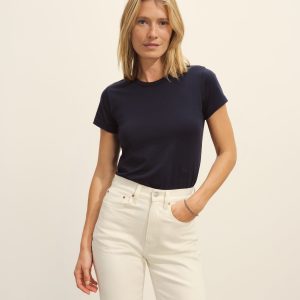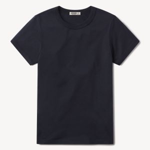 Slim fit short sleeve crewneck tee with a straight hem in 120 GSM jersey, knit from long-staple Supima cotton. Constructed with a durable rib stitch collar and double-needle cover stitch hem. Garment washed with softener for a lived-in feel.
