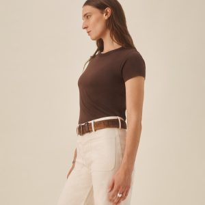 Slim fit short sleeve crewneck tee with a straight hem in 120 GSM jersey, knit from long-staple Supima cotton. Constructed with a durable rib stitch collar and double-needle cover stitch hem. Garment washed with softener for a lived-in feel.