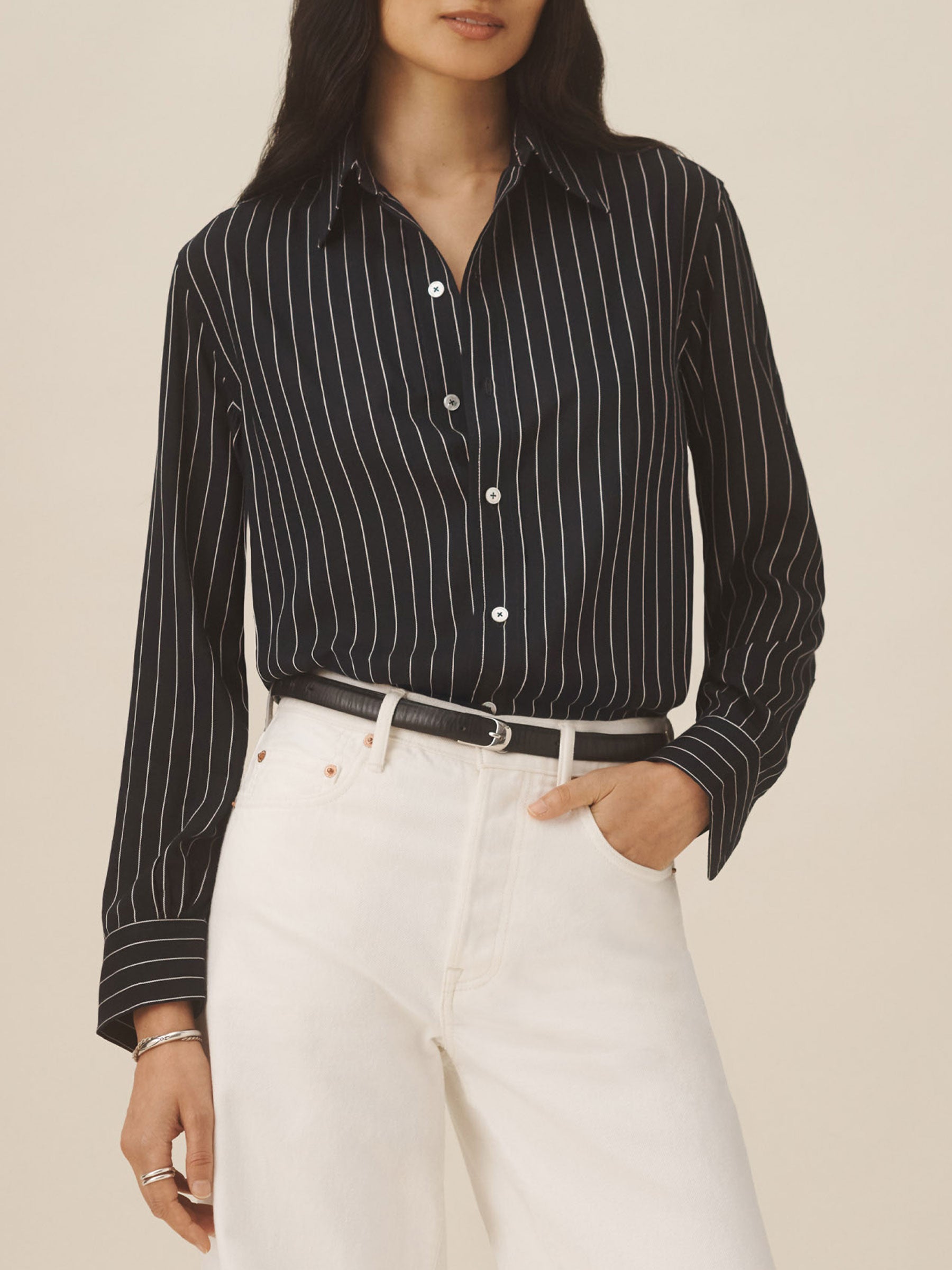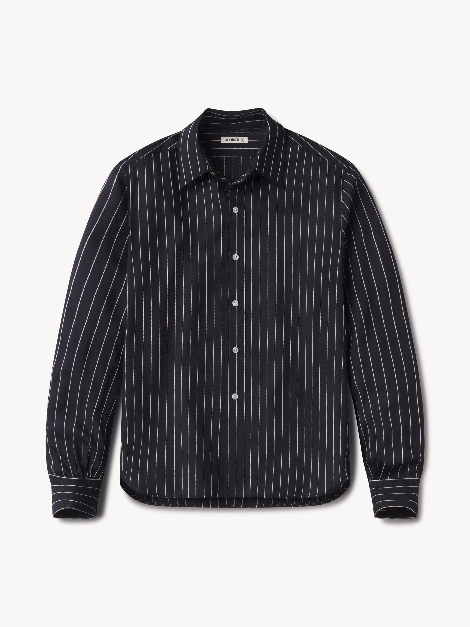 A modern take on men’s sportswear shirts from the 1940s, a relaxed button-down shirt in a silky rayon jacquard weave. Featuring a carved collar, side-seam gussets, button-through plackets along shirt front and sleeves, and pintuck detailing on back yoke and sleeve cuffs. Finished with side-seam gussets and mother of pearl buttons.