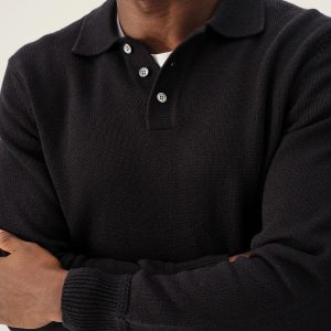 Classic fit polo sweater in a 7 gauge half cardigan rib knit from our homespun yarn-dyed cotton. Features a 3-button rib center front placket with nacre buttons and a rib collar designed to lay flat. Constructed with hand-linked seams and racking stitch detailing at the cuffs.