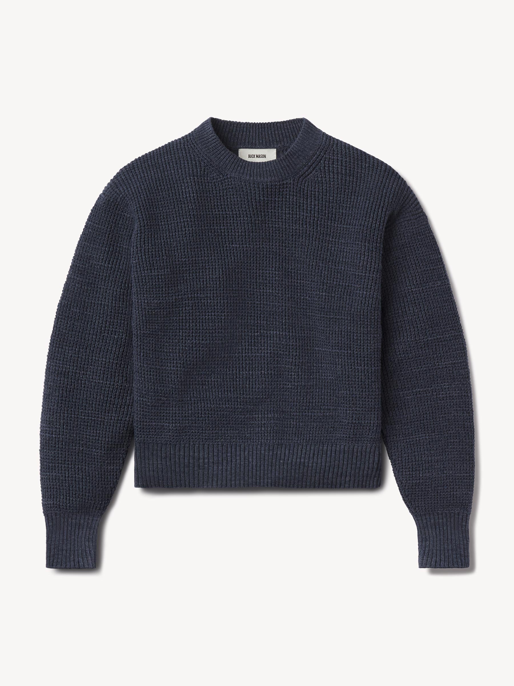 1960s inspired crewneck sweater with an easy, slim fit. Crafted from 7-gauge waffle knit yarn-dyed cotton with a light slub texture, featuring fashioning at the neck and drop-back shoulders as a nod to mid-century.