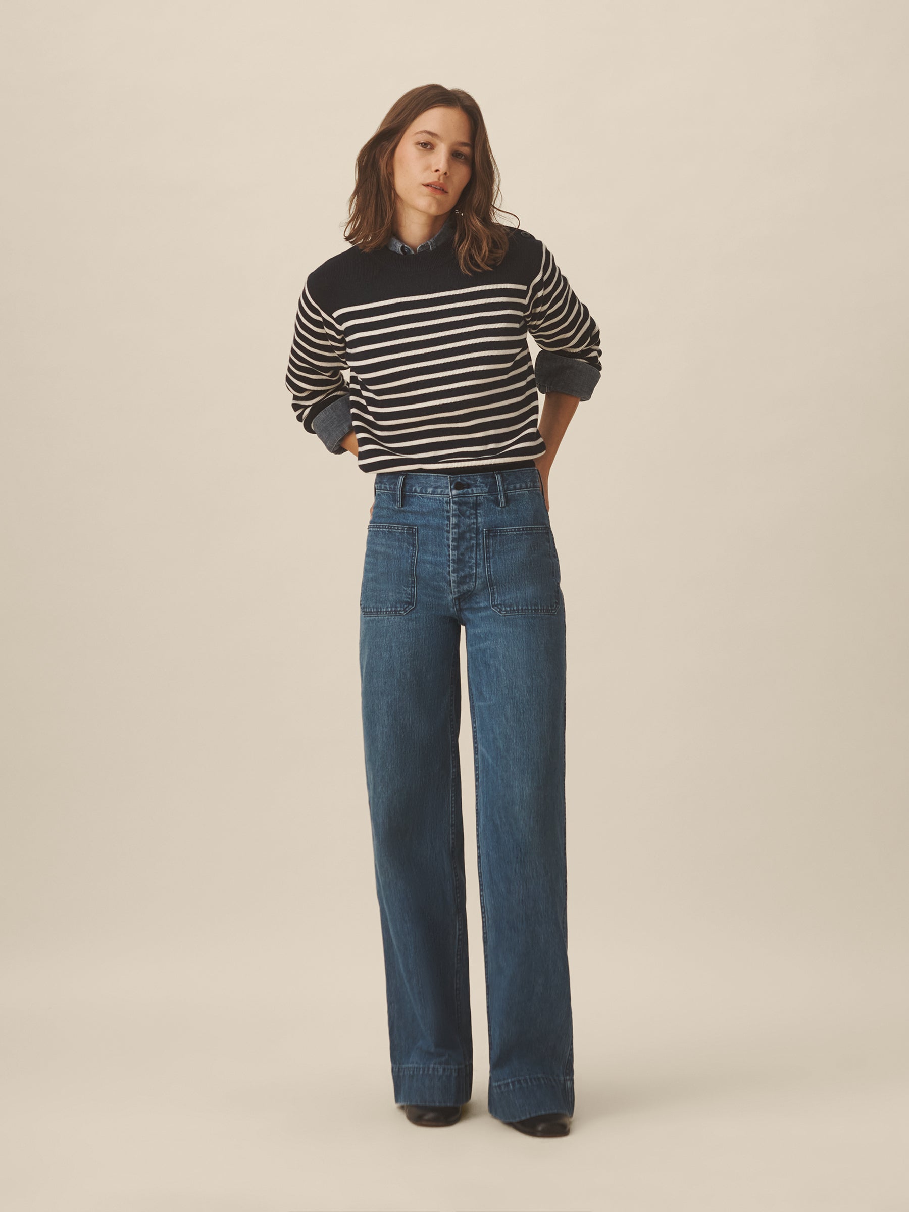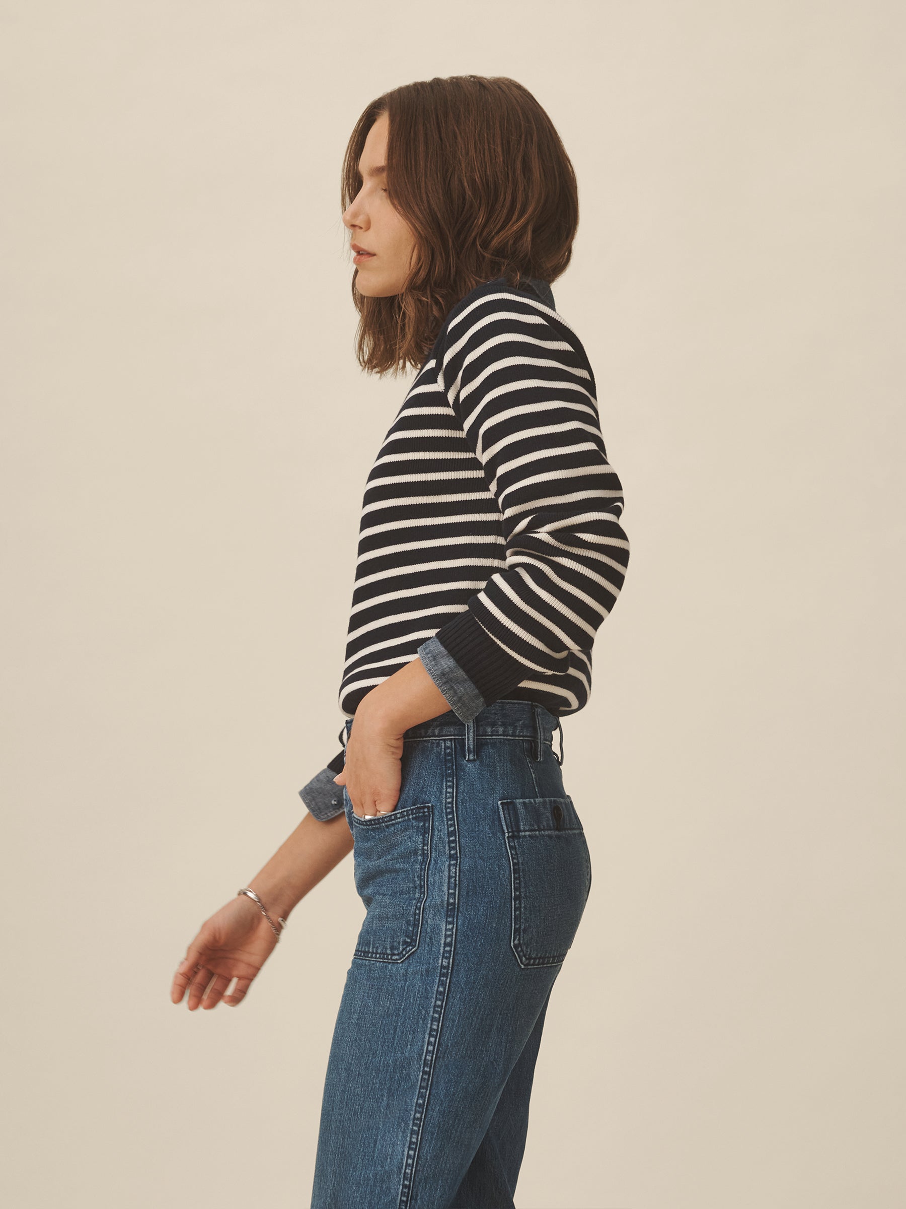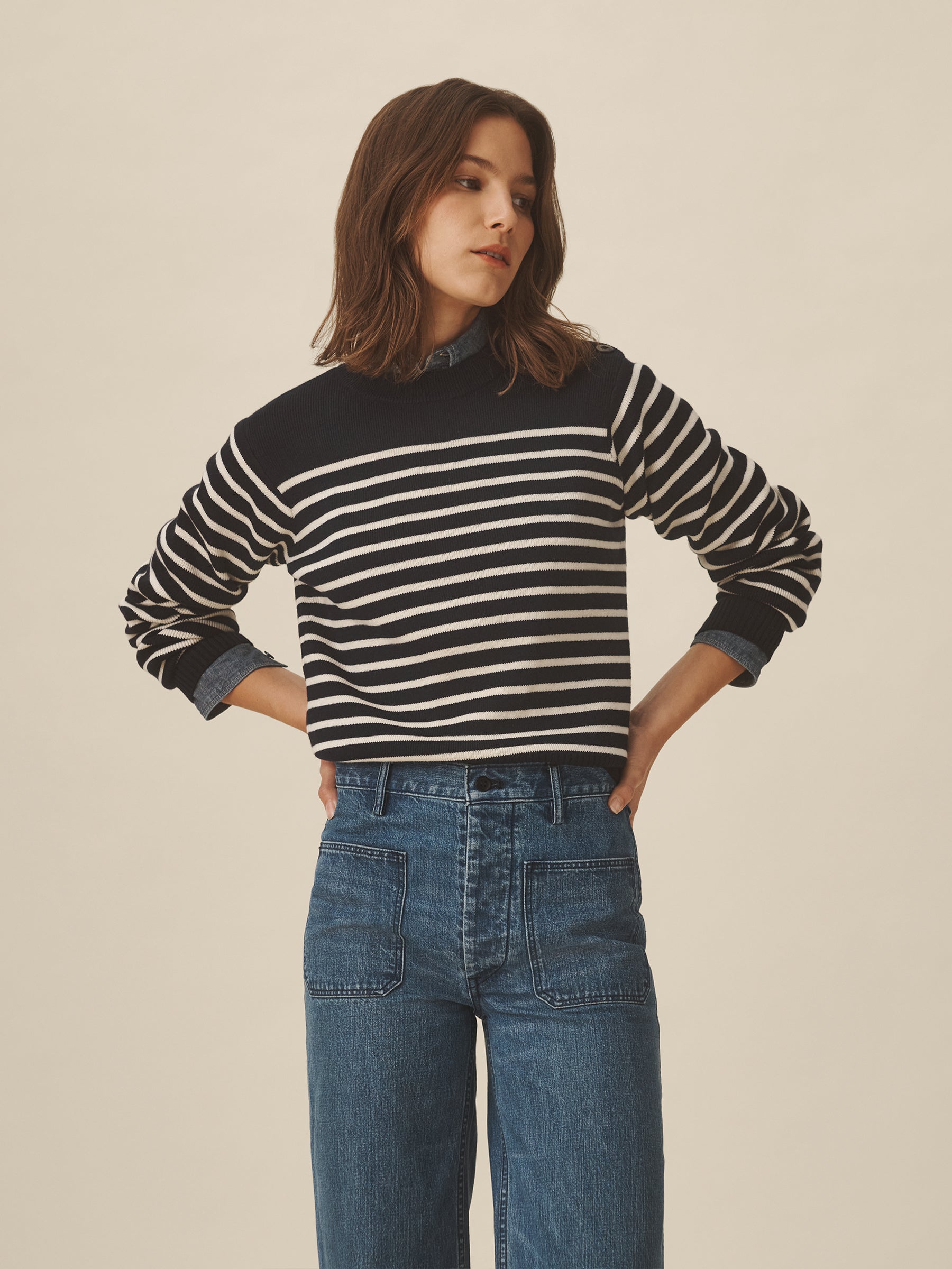 Inspired by classic French mariner sweaters, a knit in Italy Breton-striped crew from a yarn-dyed blend of extrafine merino wool and cotton. Knit with a subtly textured 12-gauge full-needle rib stitch. Designed with a slightly shrunken fit and finished with functional buttons at the shoulder.