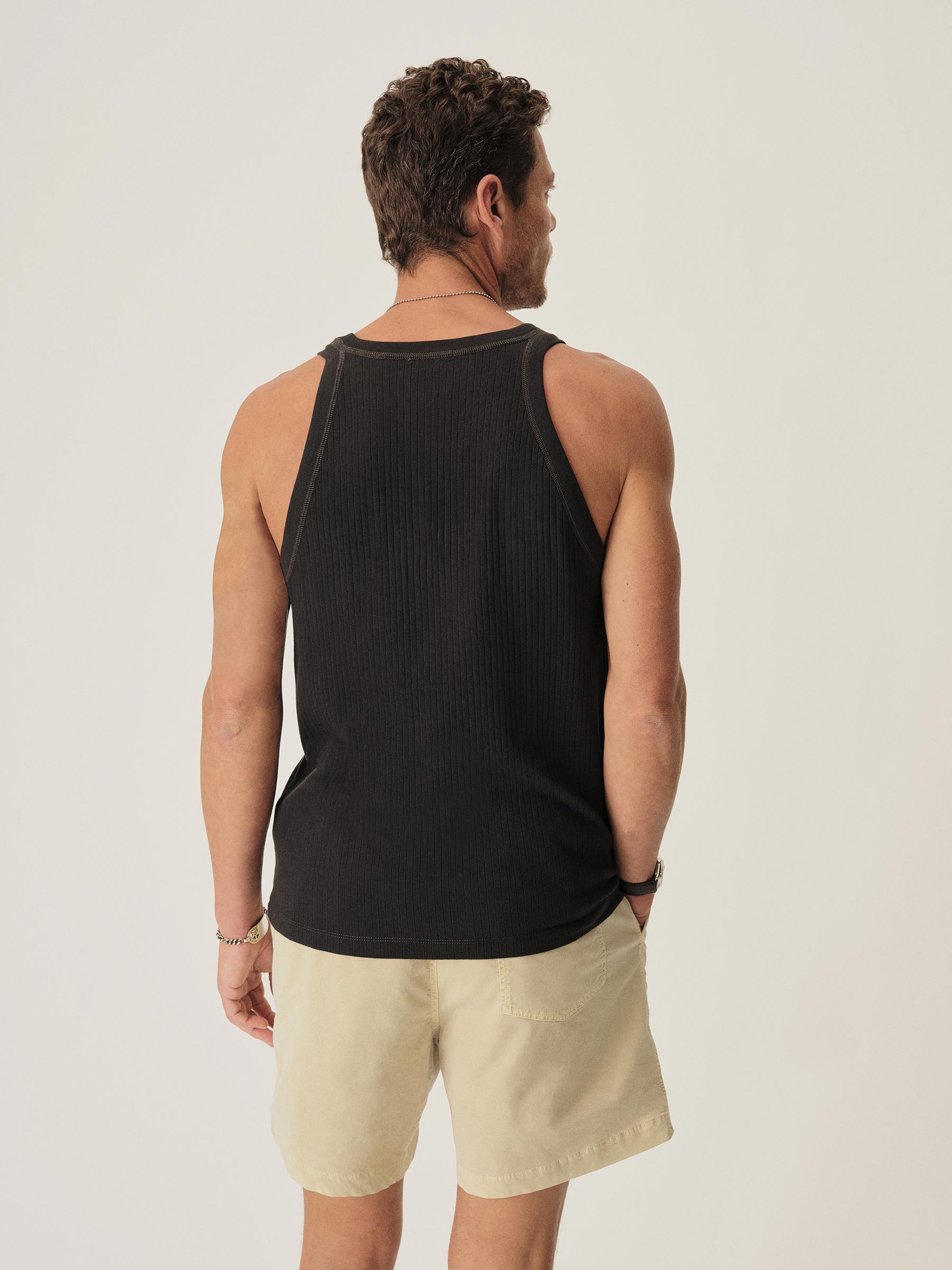 Inspired by the utilitarian design of midcentury military surplus, a distinctly textured tank featuring a 10×2 variegated rib layout. Made from 100% cotton with a 140 GSM weight that’s equally structured and breathable. Constructed with cover stitch detailing along the shoulder seams and bindings. Washed for a lived in feel.