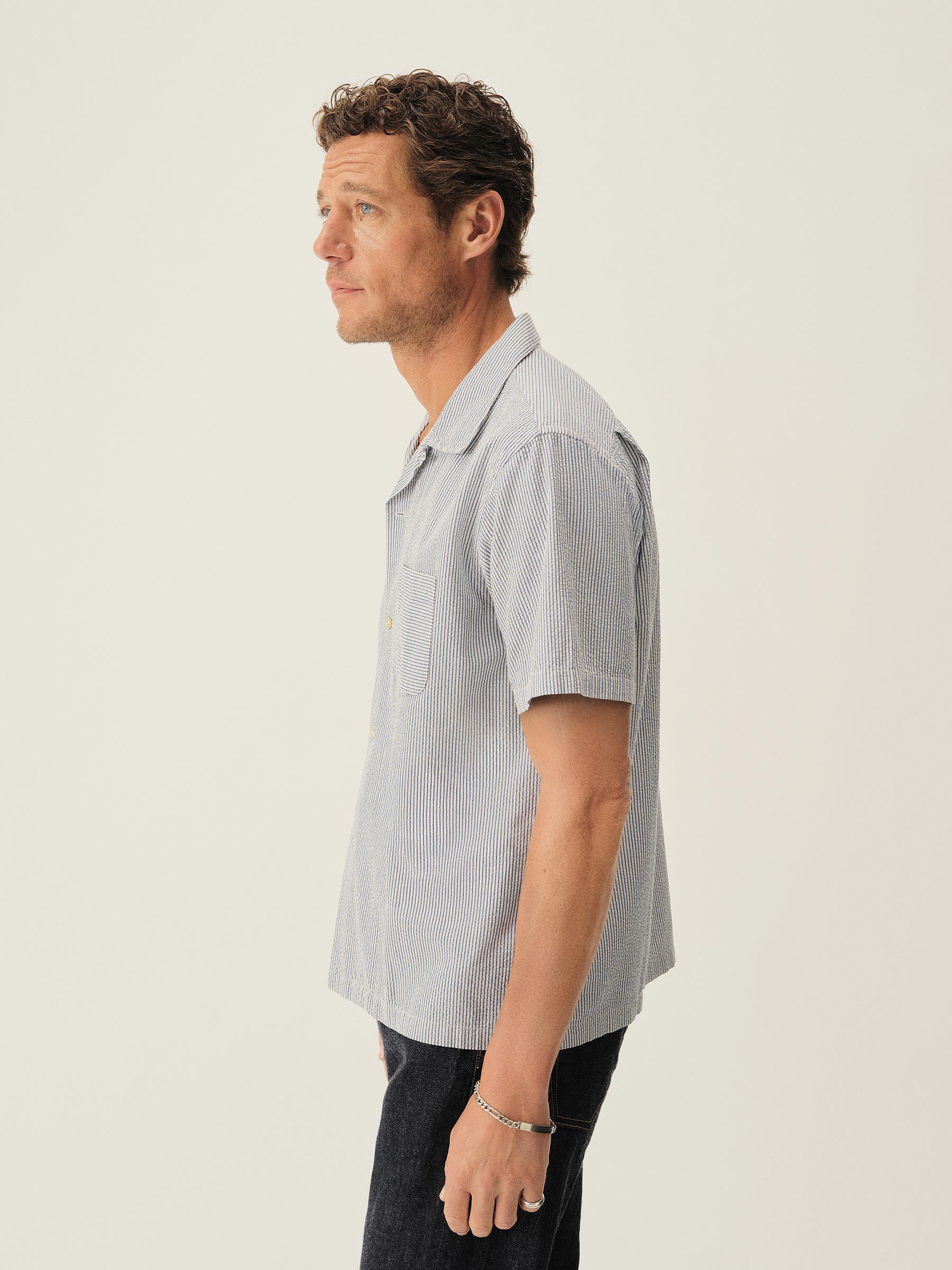 A light, airy seersucker camp shirt cut in a boxy fit with a straight hem. Features a one pocket construction and Mother of Pearl buttons.