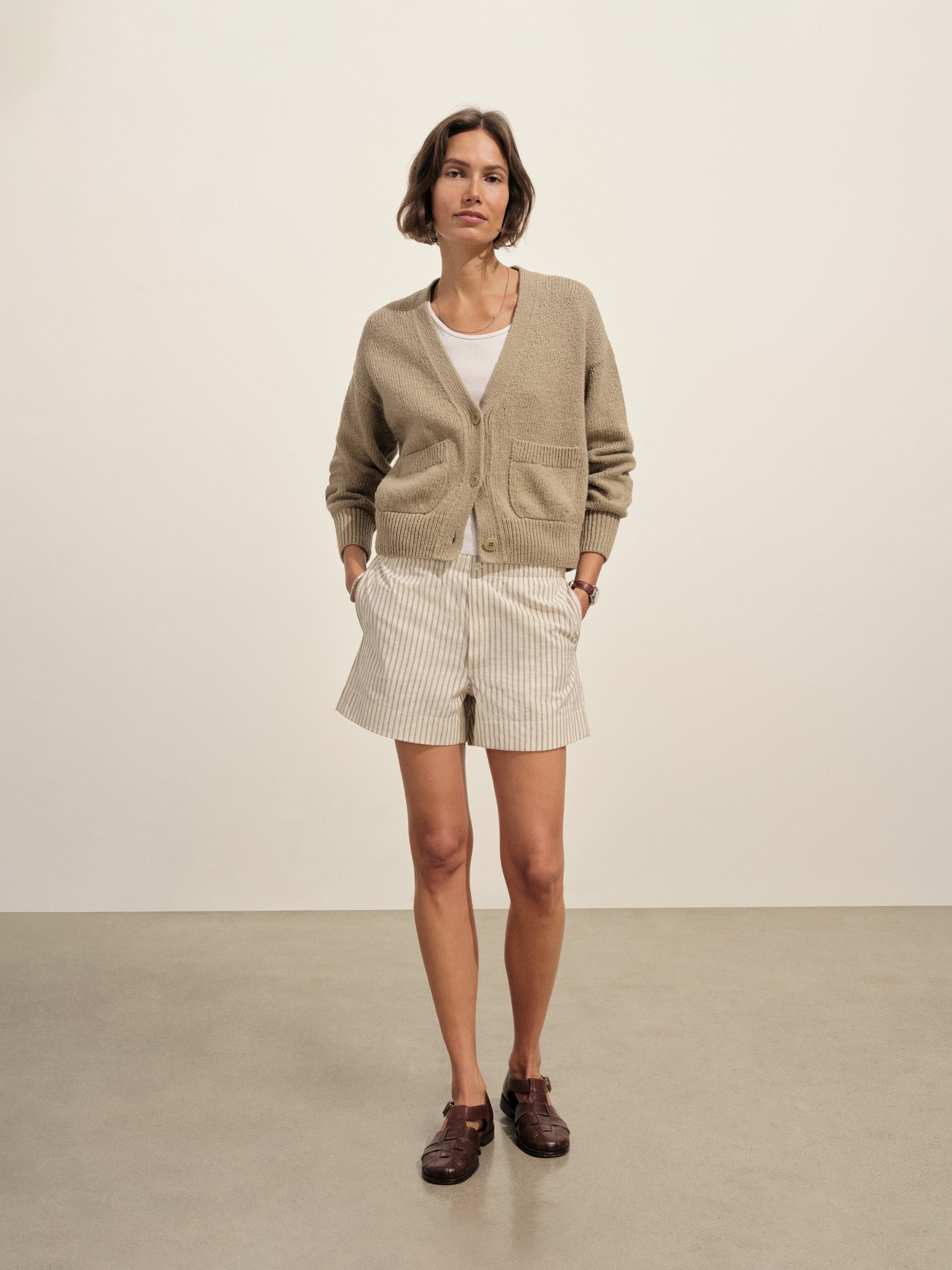 Relaxed cardigan sweater in 5 gauge lofty homespun cotton with a buttery soft finish you’ll love wrapping up in. Features two patch pockets, corozo buttons, drop shoulder, and ribbed cuffs and hem.