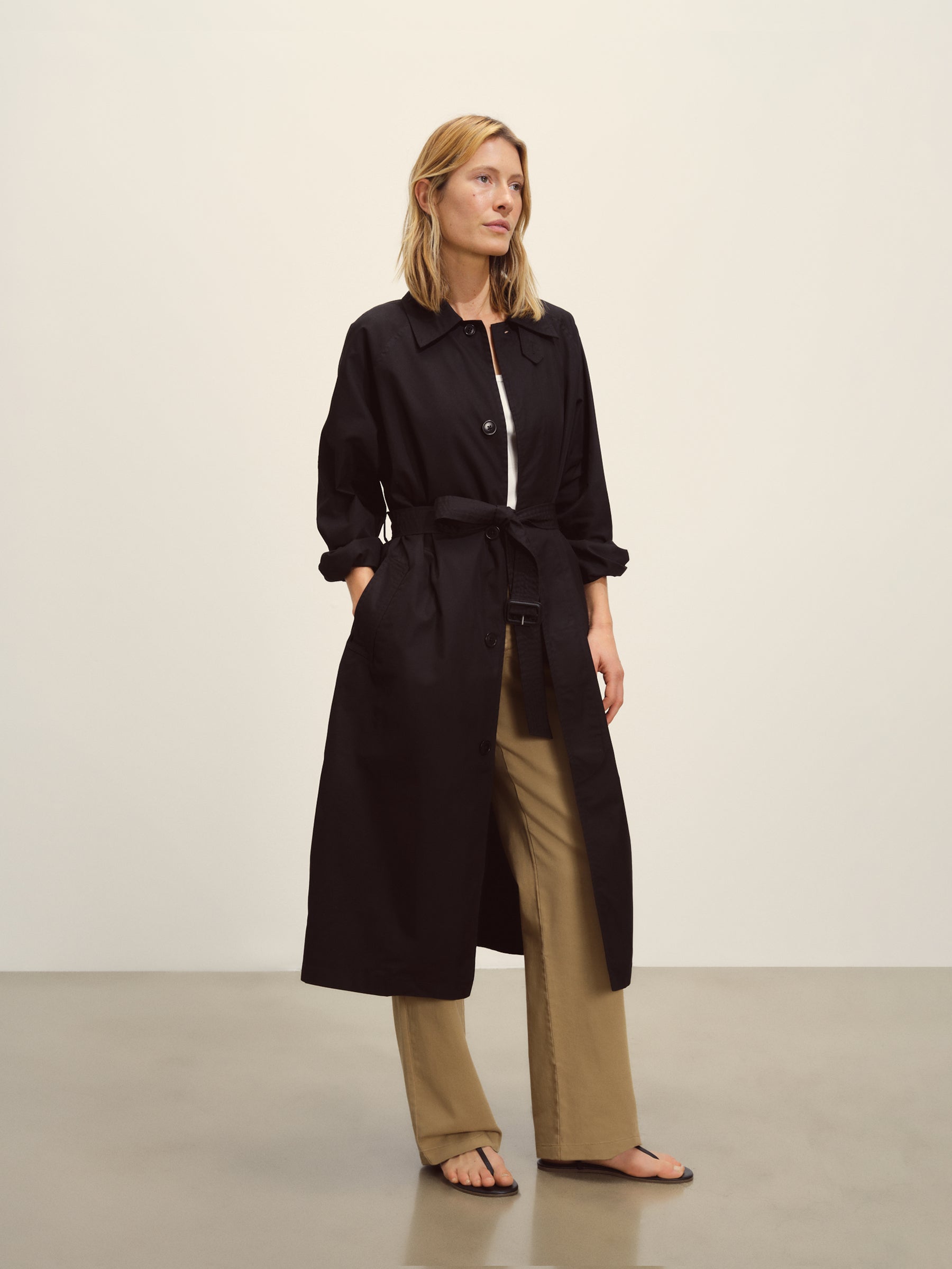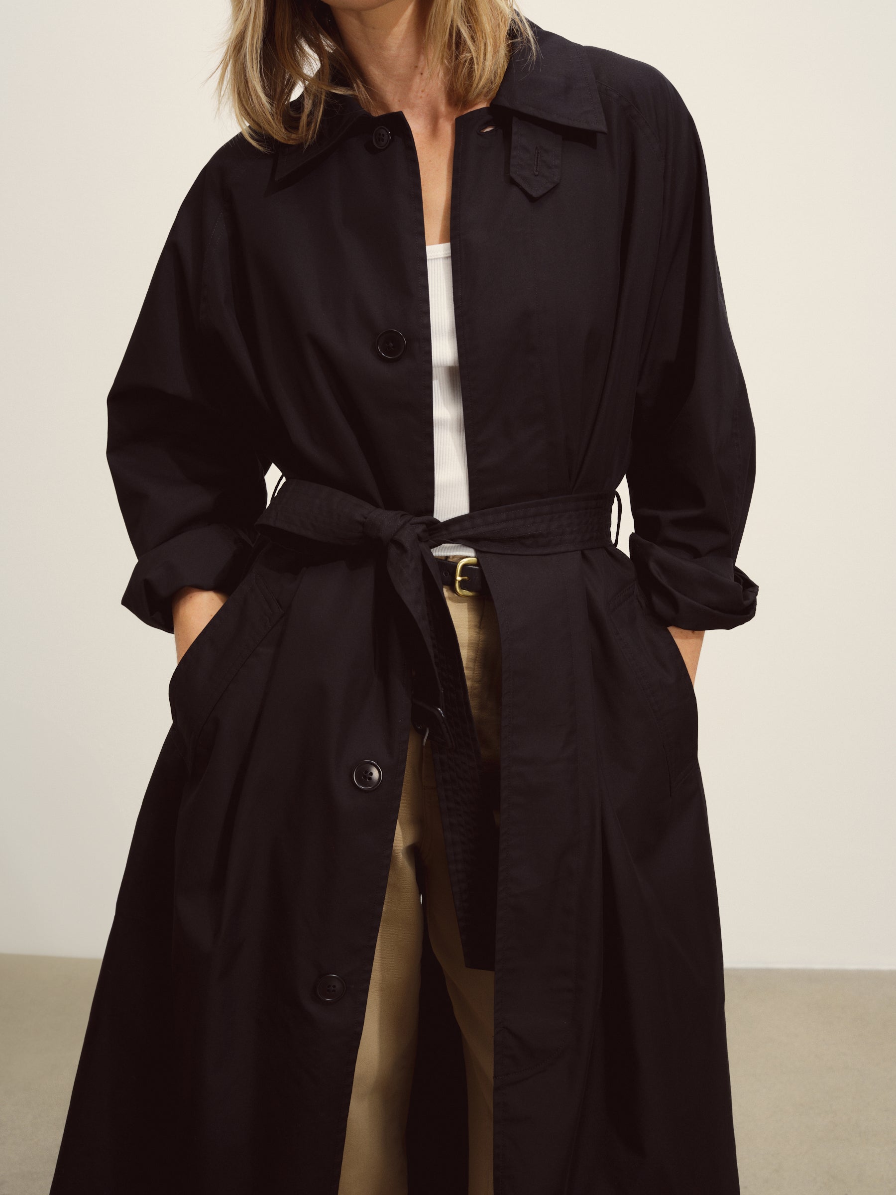Relaxed, vintage-inspired trench coat cut from 5.7 oz. yarn-dyed cotton/poly twill weather cloth with a DWR finish. Features welt pockets, raglan sleeves, and a deep back vent. Details include a collar tab, button and tab cuffs, and a removable belt with leather buckle for cinching the waist. Size down for a more fitted silhouette.
