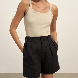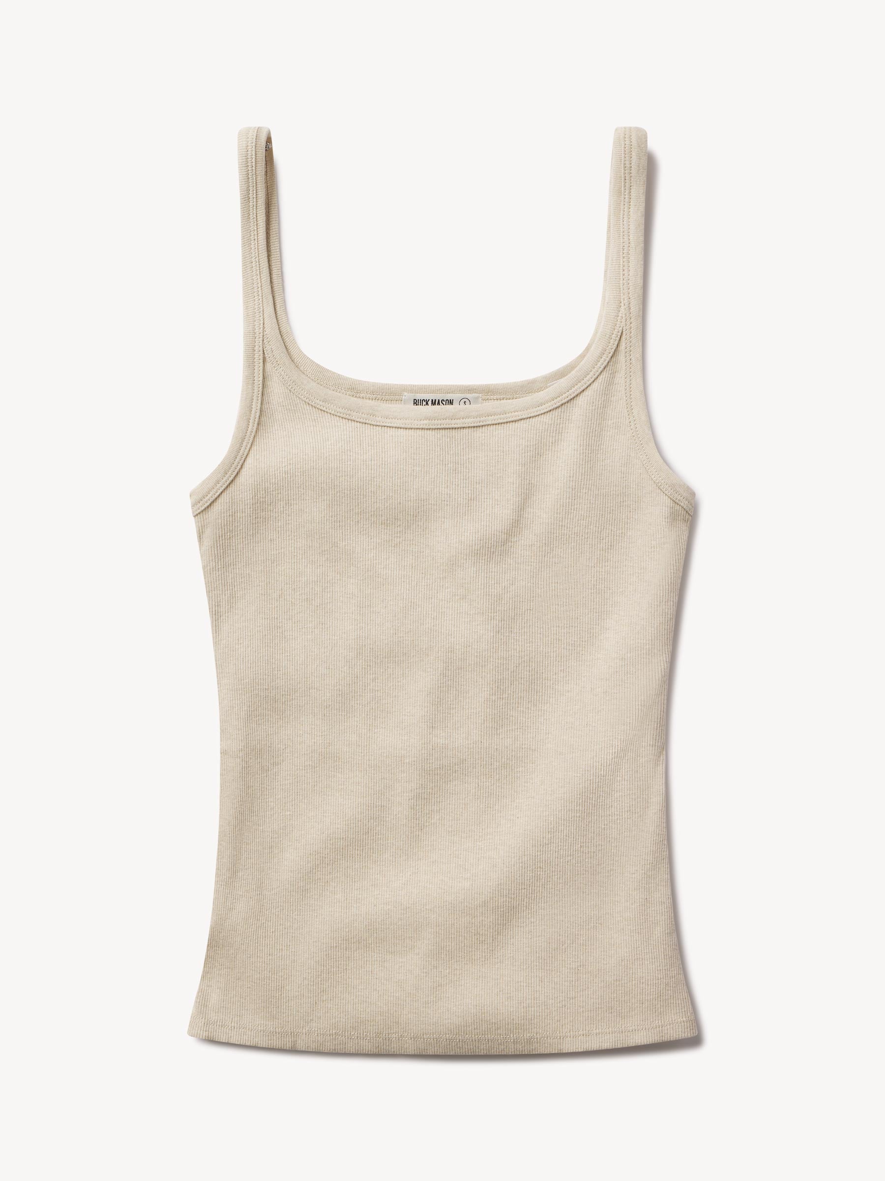 Slim fit ribbed scoop neck tank cut from 295 GSM stretch cotton that holds its shape. 2×2 rib structure—two rows of rib stitch, two rows of jersey stitch—is offset by contrast 1×1 rib at the neck. Constructed with coverstitching throughout and flatlock stitching at the side seams. Garment washed for a lived-in feel.