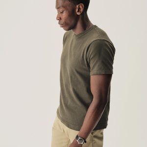 Cut from a midweight 200 GSM USA-grown cotton, developed, milled, and sewn at BM Knitting Mills in Mohnton, PA. This classic fit crewneck tee has a straight hemline, bound neck and screen-printed label for comfort. Constructed with a split-needle cover stitch at shoulders and armholes. Double-washed for a soft, smooth texture and consistent fit.