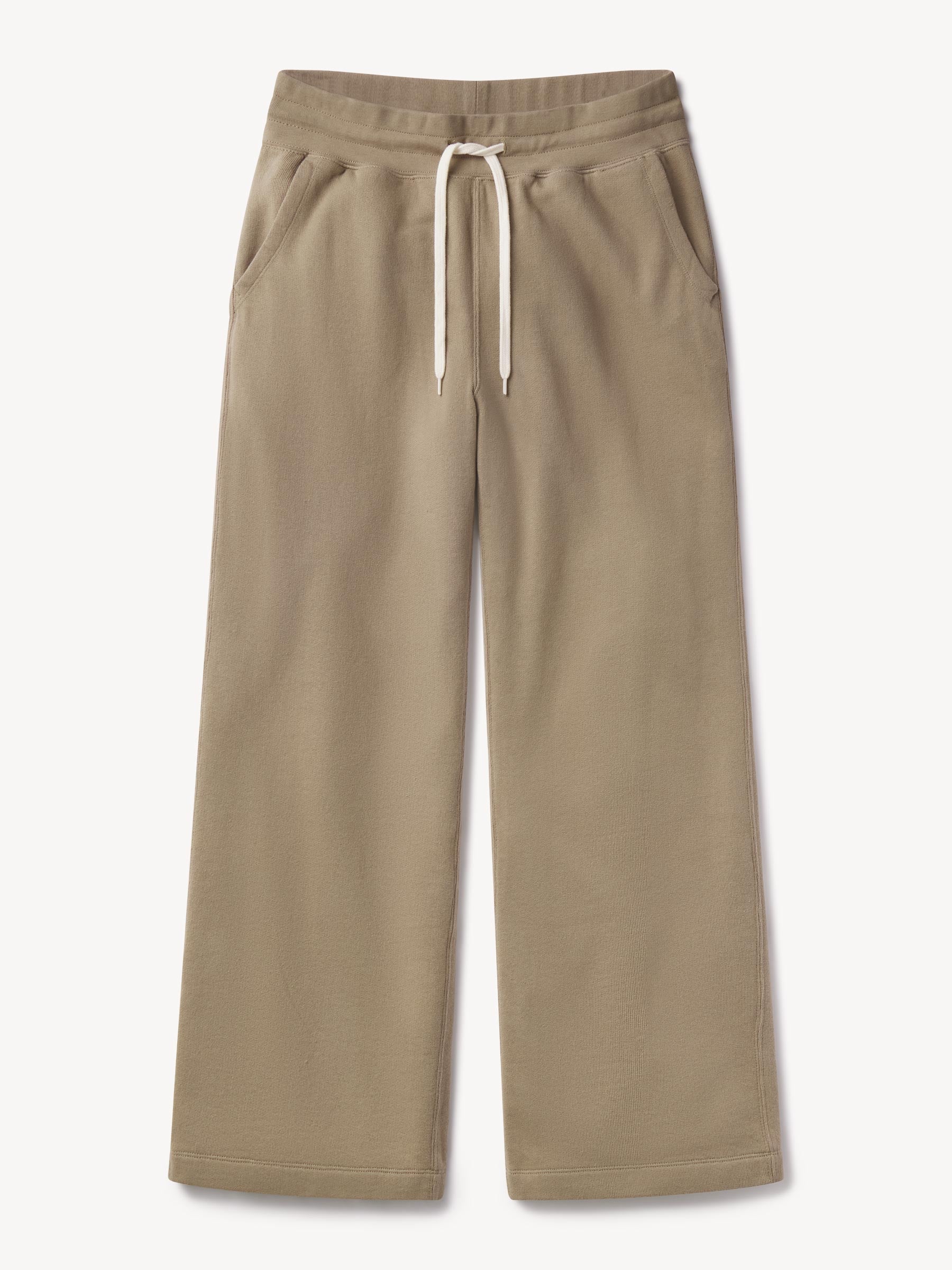 Wide leg, high-waisted sweatpants with a 28” inseam. Can be worn at the natural waist or lower for a more relaxed fit. Cut from 290 GSM cotton French terry with a semi-brushed back. Features a wide, ribbed waistband with drawcord for fit adjustments. Constructed with straddle stitching at seams for durability. Garment dyed and washed for a lived-in feel. Pair with our Vintage Overloop Crew.