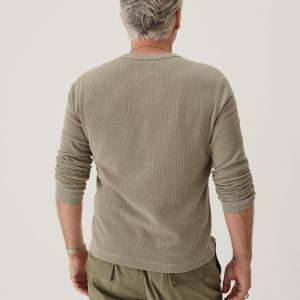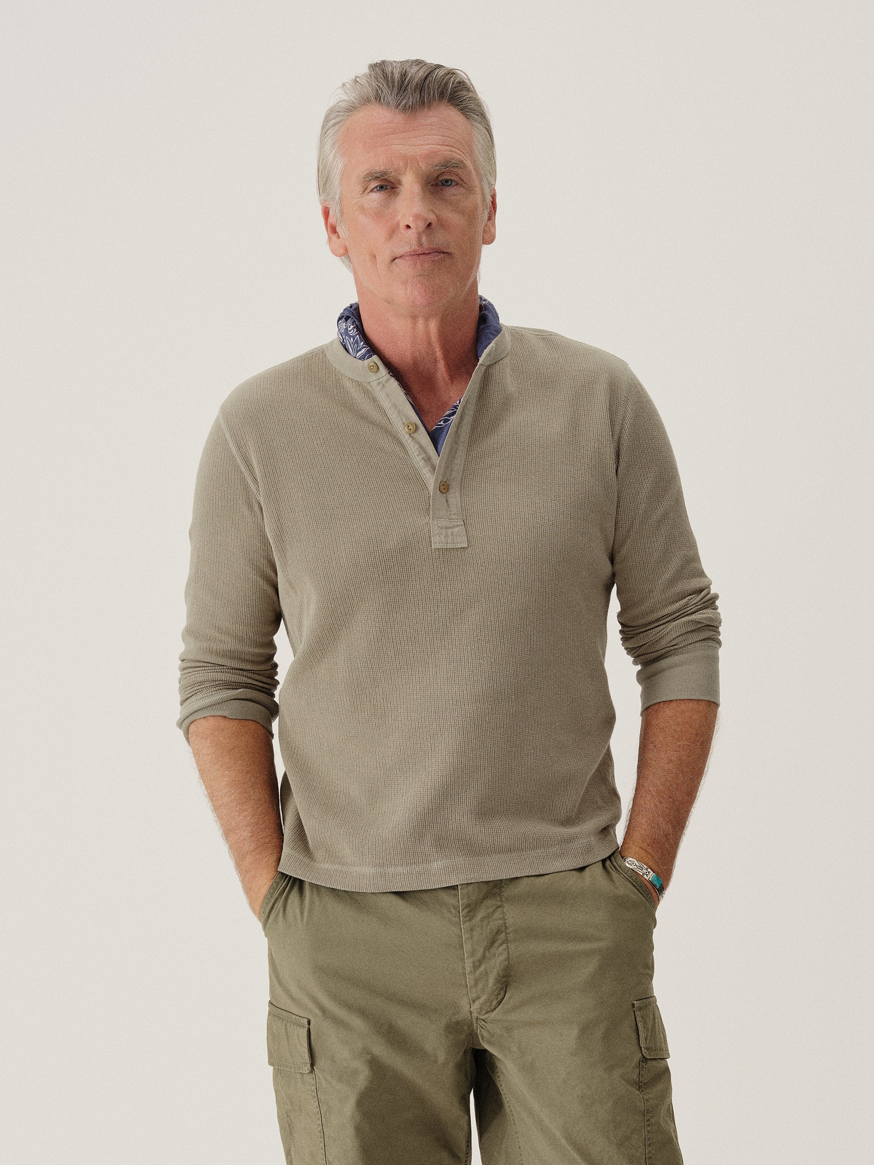 Classic fit thermal long sleeve henley with a straight hem. This 250 GSM French rib cotton double knit features a waffle-knit face and a smooth jersey back. Details include a woven three-button placket and corozo buttons. Constructed with ribbed cuffs and flat-lock stitching throughout for improved comfort and durability. Garment washed with enzymes and softener for a lived-in feel.