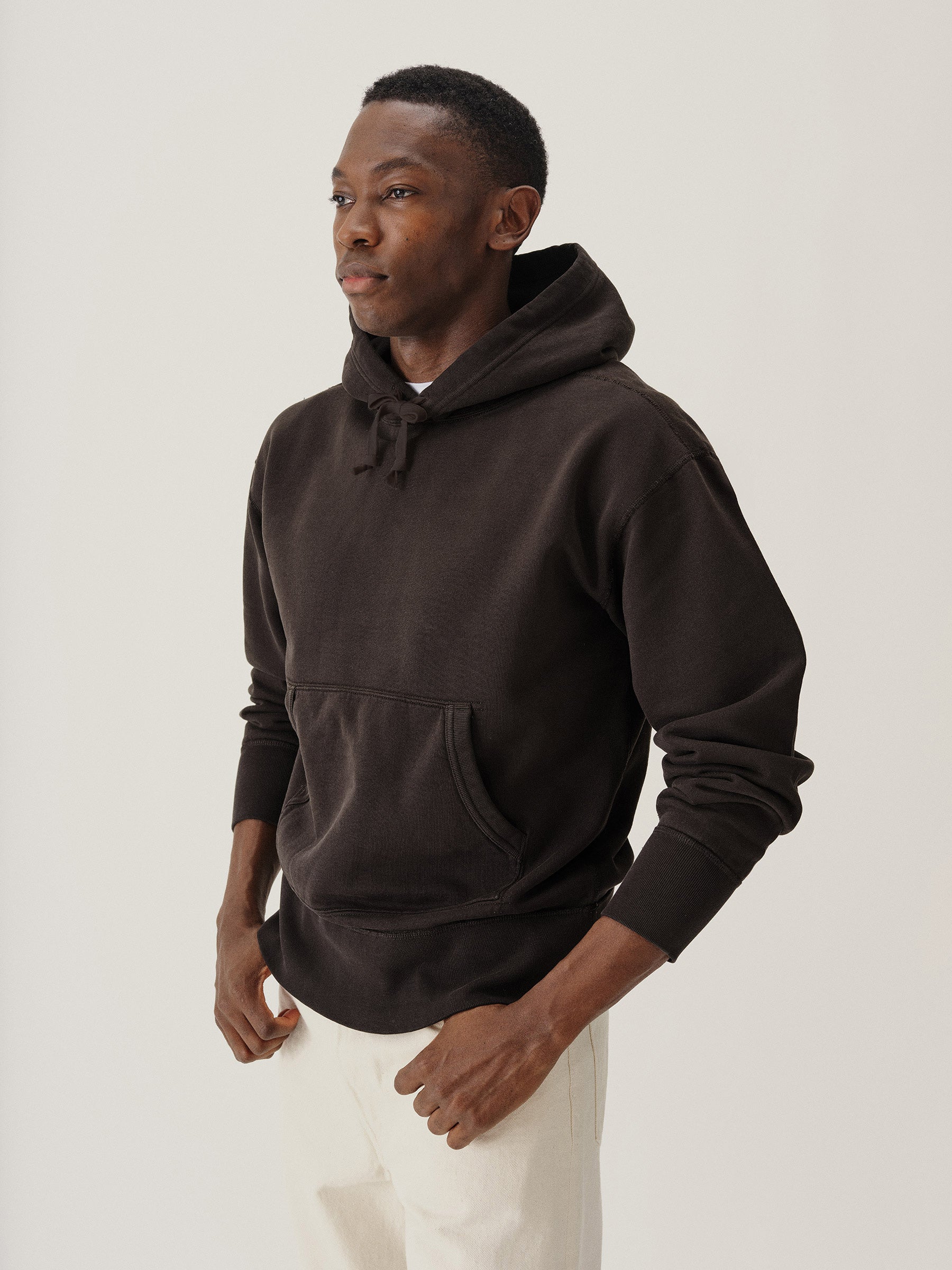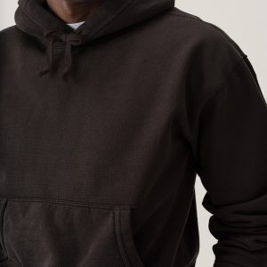 A midcentury-inspired hooded sweatshirt made from plush, not-too-heavy, not-too-light, welterweight French terry. Features a double-layer hood and kangaroo front pocket.