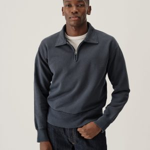 A midcentury-inspired quarter-zip collared sweatshirt made from plush, not-too-heavy, not-too-light, welterweight French terry. Features a foldover collar and front zip closure.